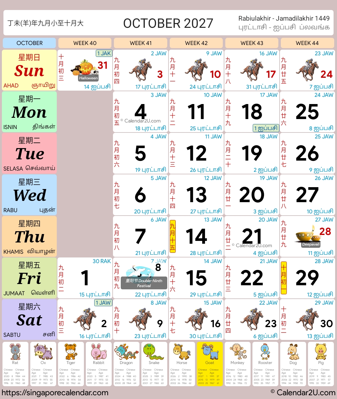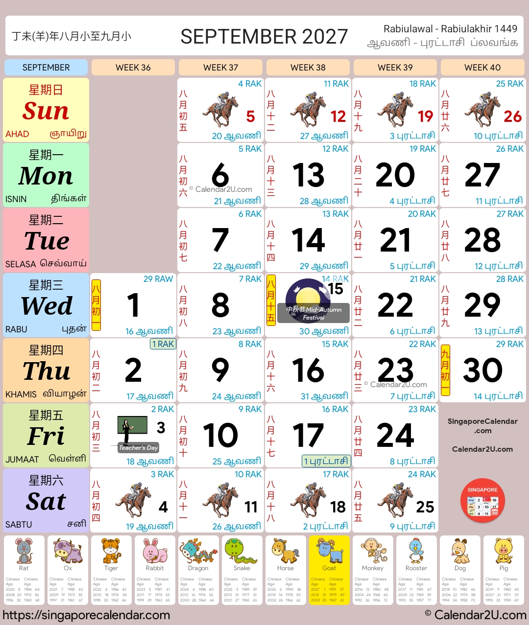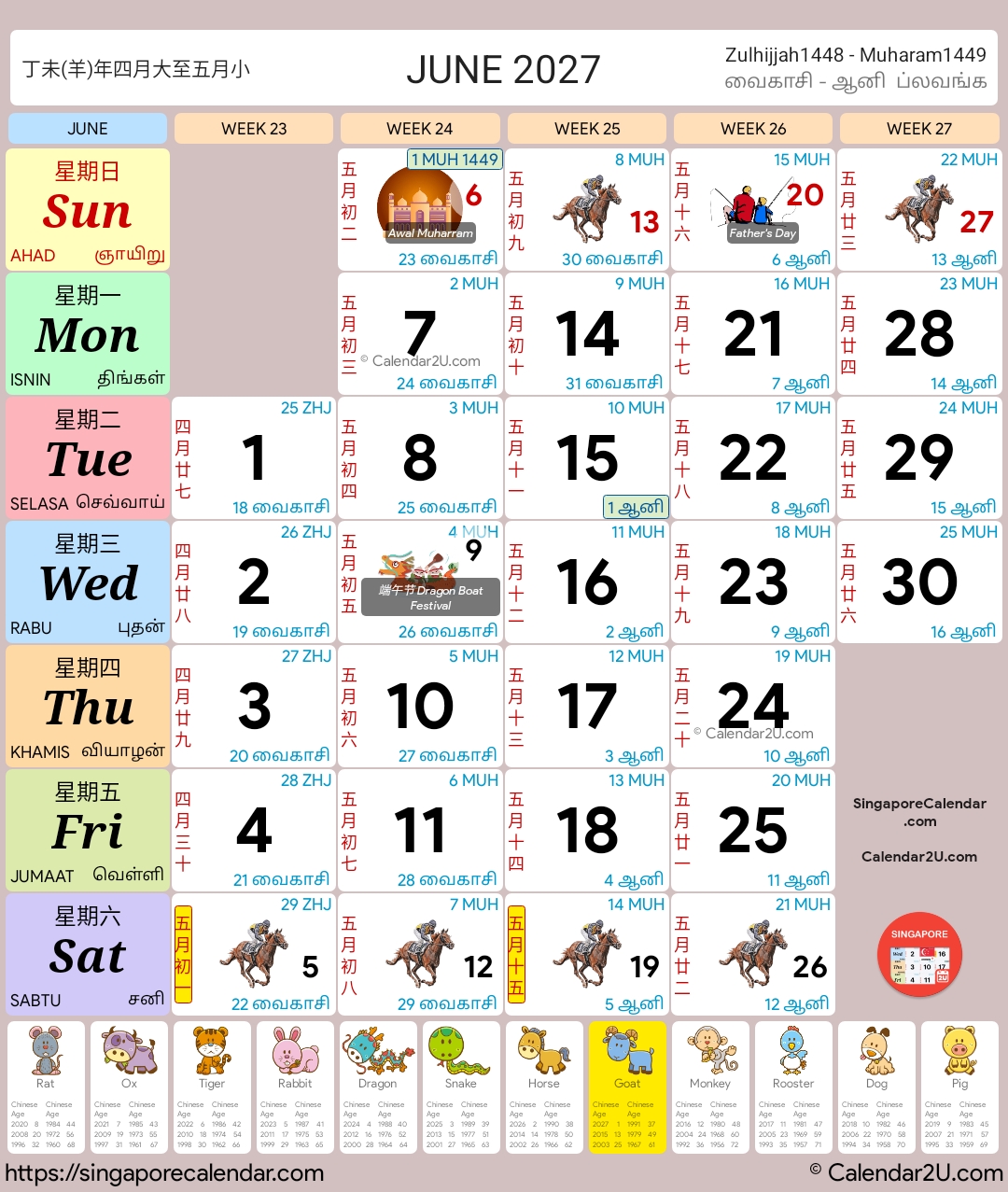 These calendars have the traditional horse race design with a modern twist. They contain information like public holidays, school holidays and important festivals. The dates also include Hijri dates for the Muslims and Chinese Lunar dates for the Chinese. Other than that, Chinese Zodiacs are also available at the bottom portion of each calendar.