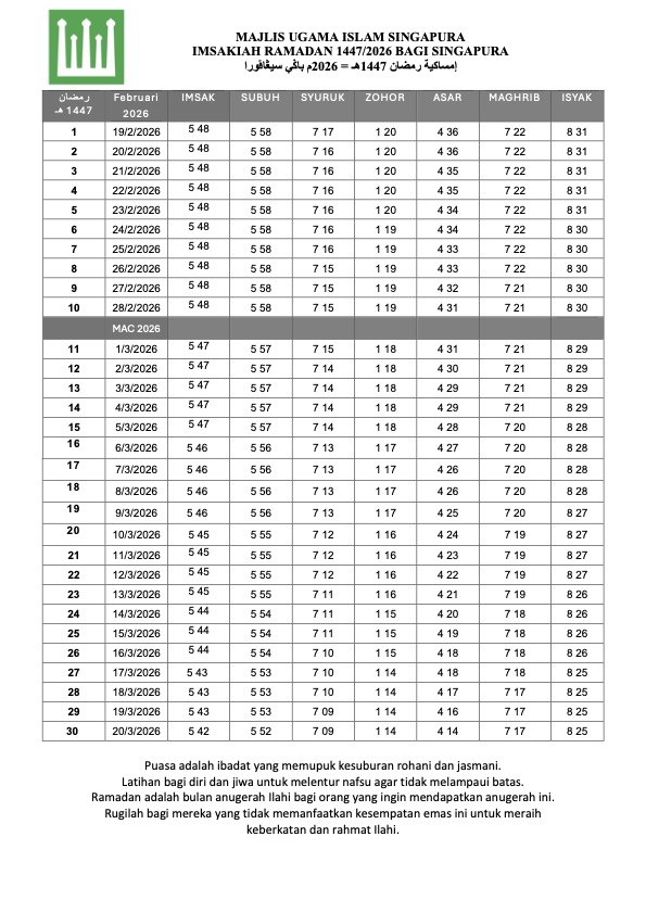 Jadual atau takwim ini akan membantu umat Islam di seluruh negara untuk merujuk waktu berbuka puasa dan imsak semasa menjalani ibadah puasa di bulan Ramadan Al-Mubarak. Jadual Waktu Berbuka Puasa dan Imsak Ramadan 2026 bersamaan 1447H bagi seluruh Singapura boleh dimuat turun dengan melayari laman sesawang rasmi MUIS.